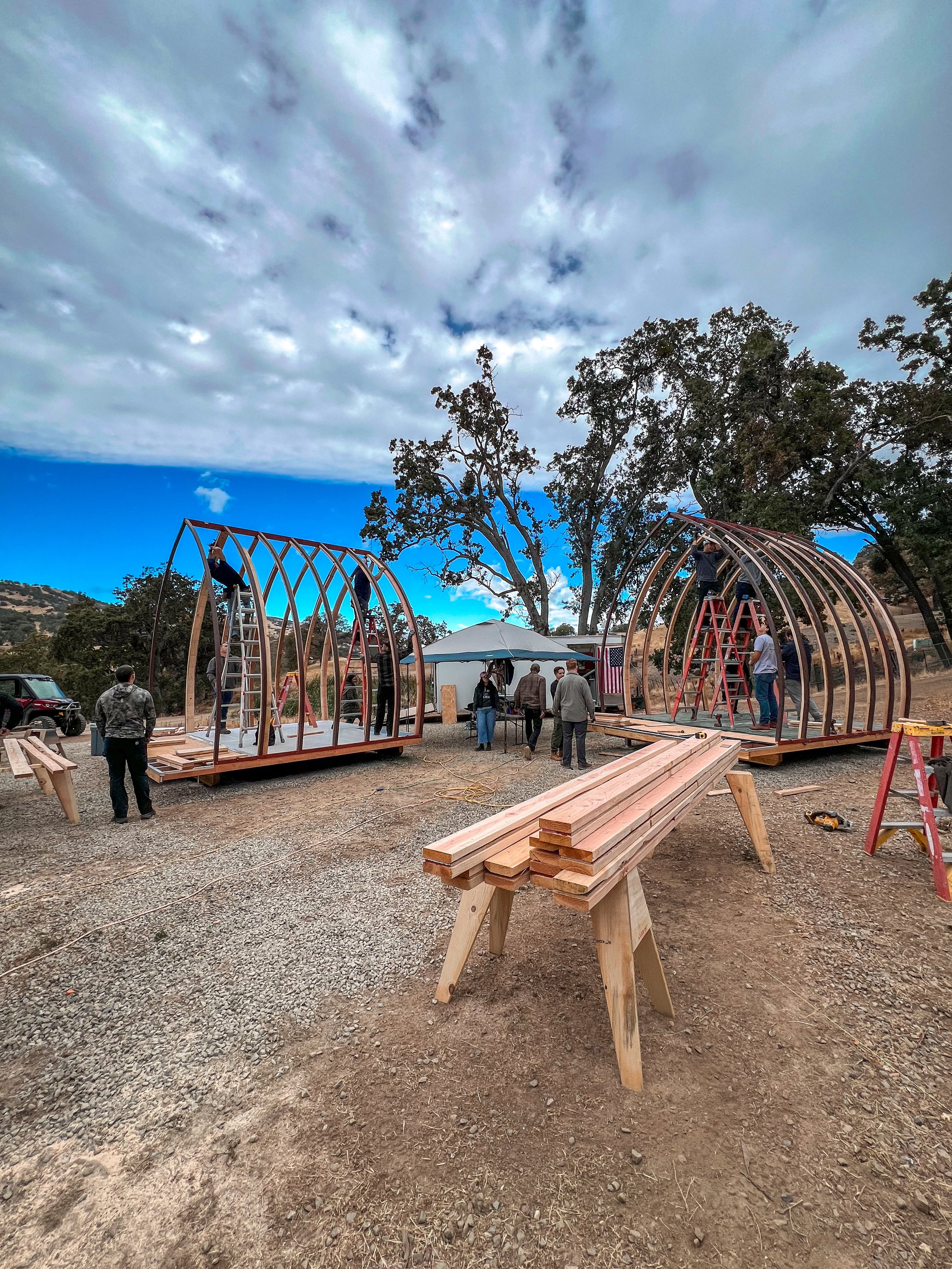 We are building our arched cabins by hand as part of a phased expansion of the ranch. Four cabins are complete, with additional builds underway and projected for completion by fall 2026.